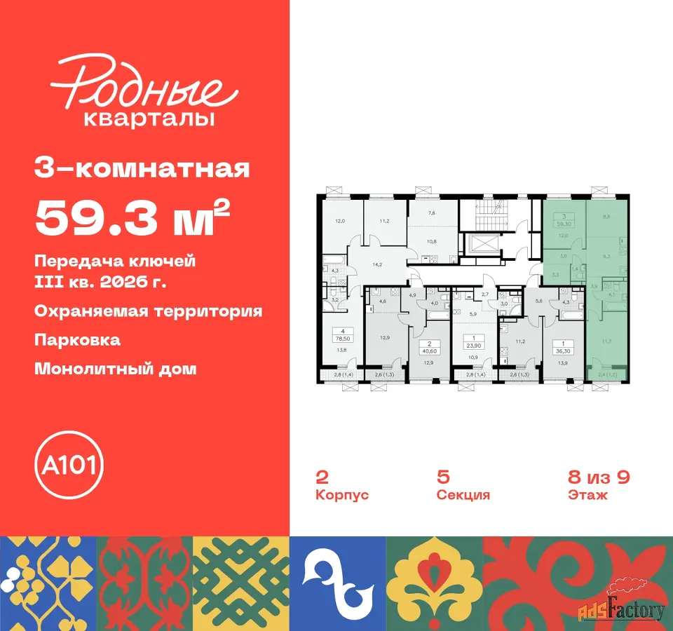 Дом монолитный, многоподъездный, высотой 9 этажей. Квартира находится в 5-й секции в корпусе 2. На этаже 5 квартир. В подъезде 1 грузовой лифт. Начало строительства - 4 квартал 2023 года. Окончание строительства - 3 квартал 2026 года. Оформление сделки по договору долевого участия.