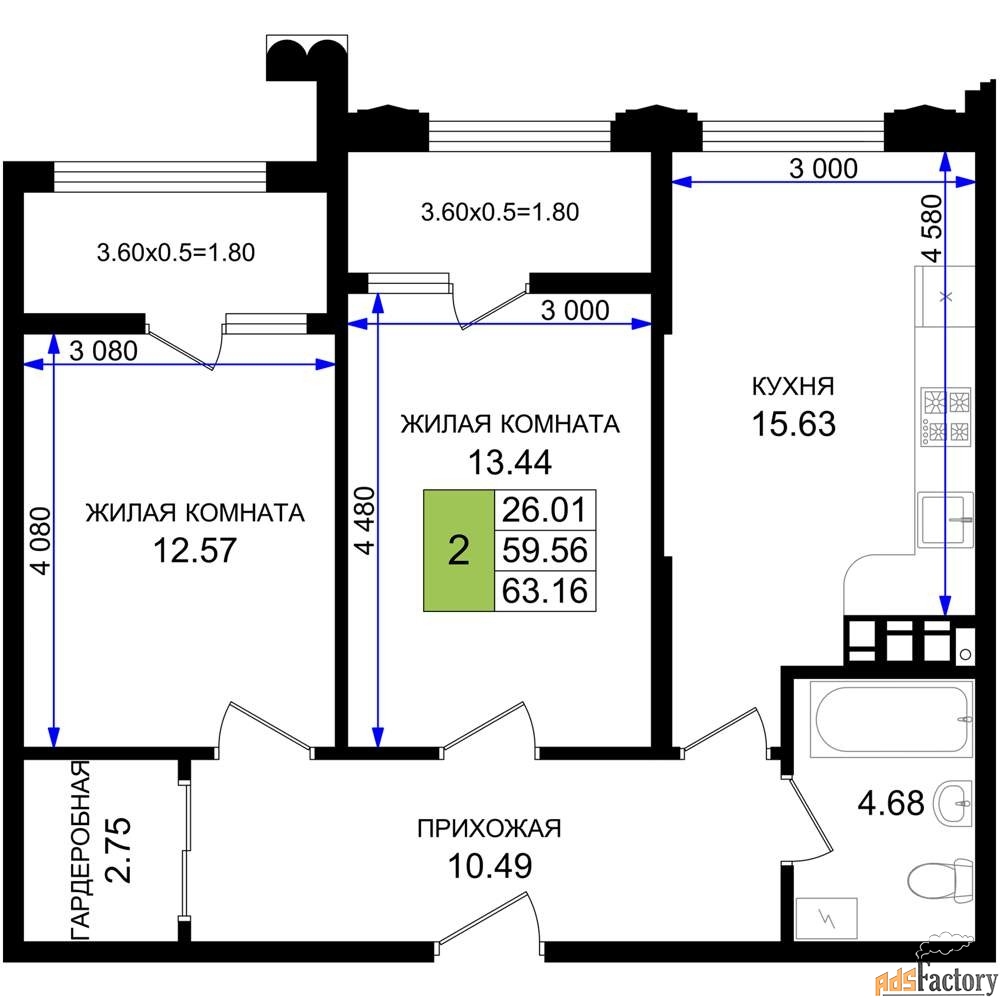 Жилая площадь 26.01 м2, кухня 15.63 м2, предчистовая отделка.