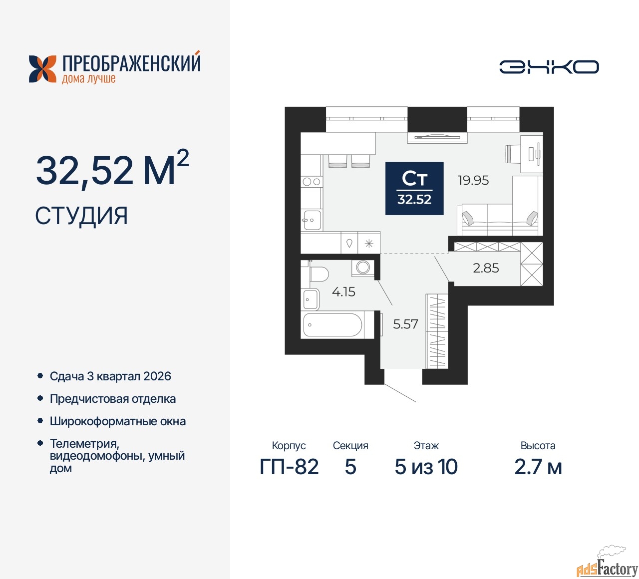 Дом монолитный, многоподъездный, переменной этажности, от 8 до 12 этажей. Квартира находится в 5-й секции высотой 10 этажей в корпусе ГП-82. На этаже 7 квартир. В подъезде 1 пассажирский и 1 грузовой лифт. Окончание строительства - 3 квартал 2026 года. Оформление сделки по договору долевого участия.