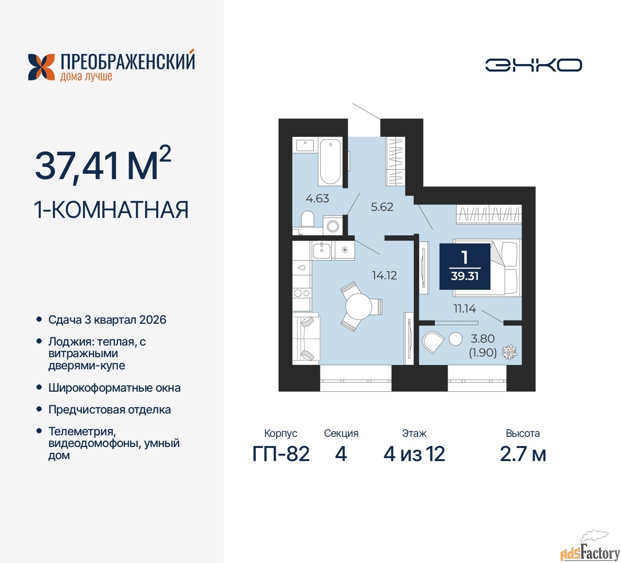 | Высота потолков (м.) | 2.7 |