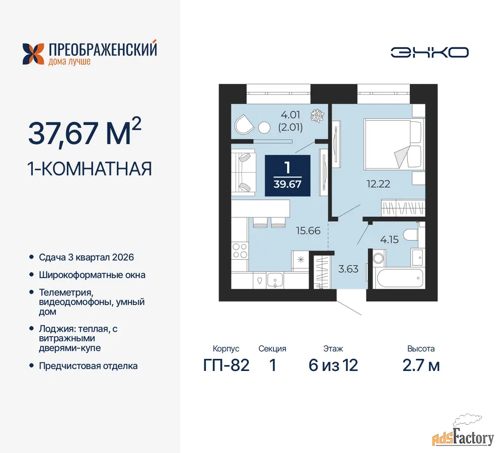 Дом монолитный, многоподъездный, переменной этажности, от 8 до 12 этажей. Квартира находится в 1-й секции высотой 12 этажей в корпусе ГП-82. На этаже 7 квартир. В подъезде 1 пассажирский и 1 грузовой лифт. Окончание строительства - 3 квартал 2026 года. Оформление сделки по договору долевого участия.