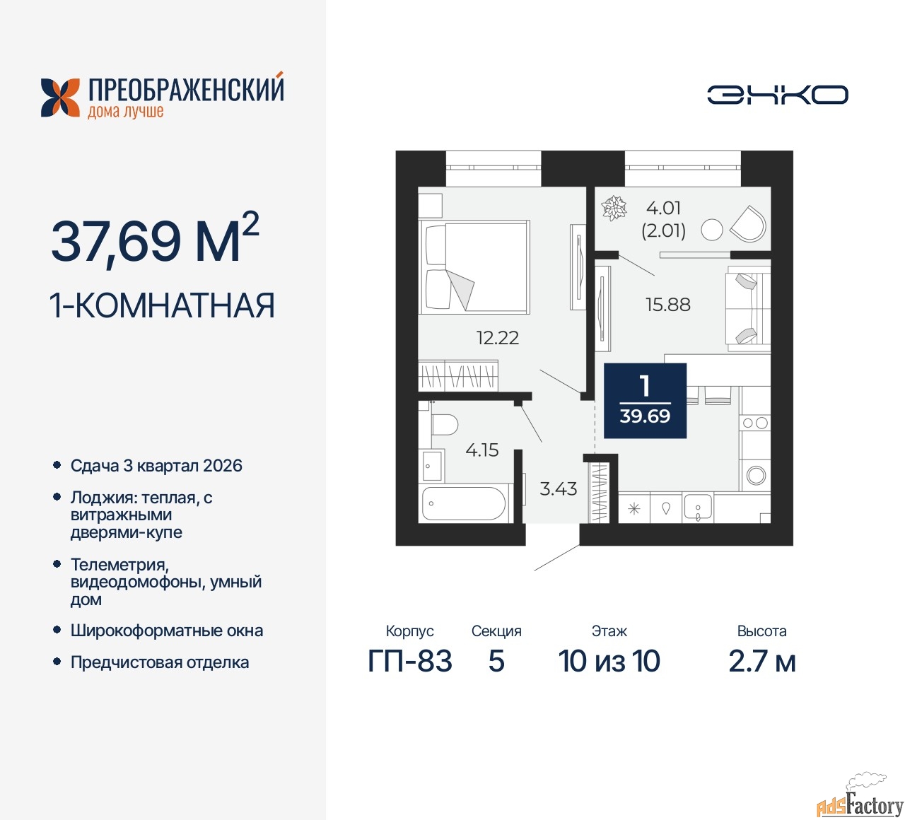 | Высота потолков (м.) | 2.7 |