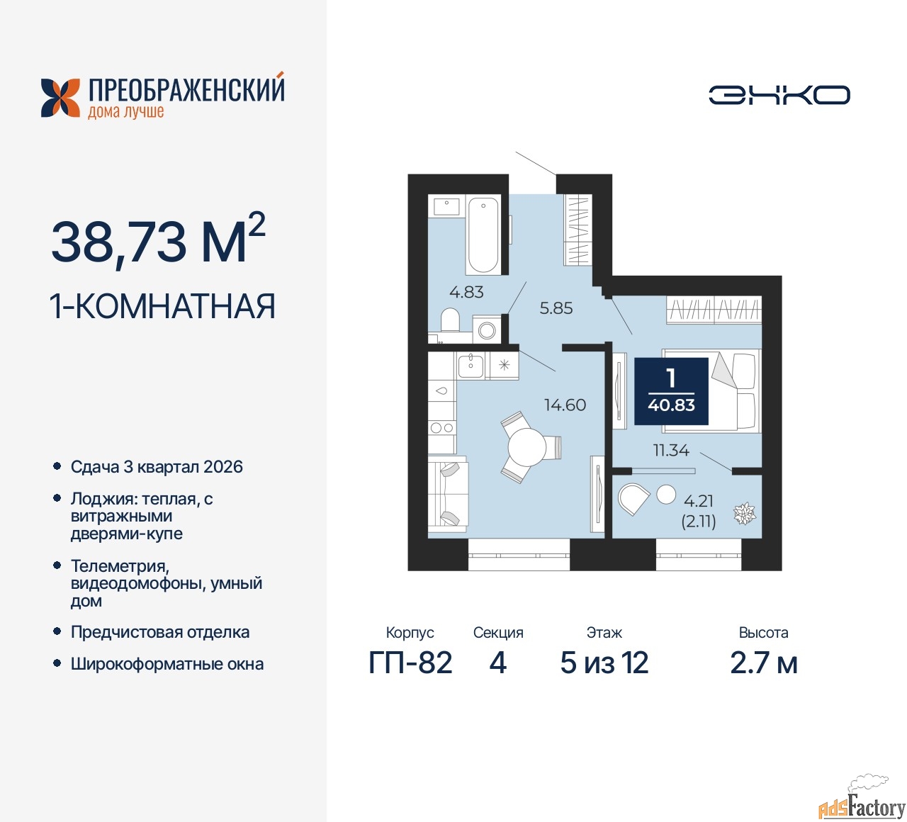 | Высота потолков (м.) | 2.7 |