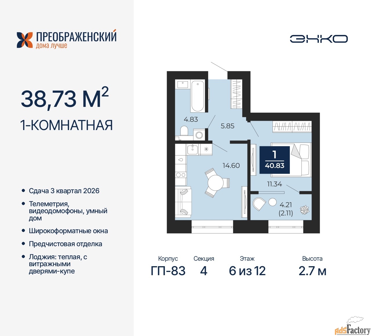 Дом монолитный, многоподъездный, переменной этажности, от 8 до 12 этажей. Квартира находится в 4-й секции высотой 12 этажей в корпусе ГП-83. На этаже 6 квартир. В подъезде 1 пассажирский и 1 грузовой лифт. Начало строительства - 4 квартал 2023 года. Окончание строительства - 3 квартал 2026 года. Оформление сделки по договору долевого участия.