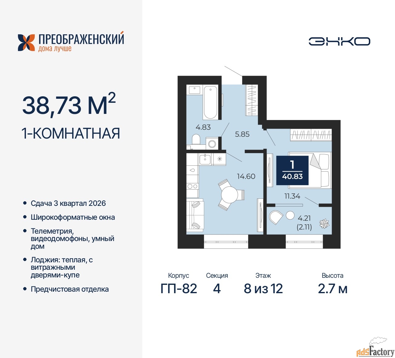| Высота потолков (м.) | 2.7 |