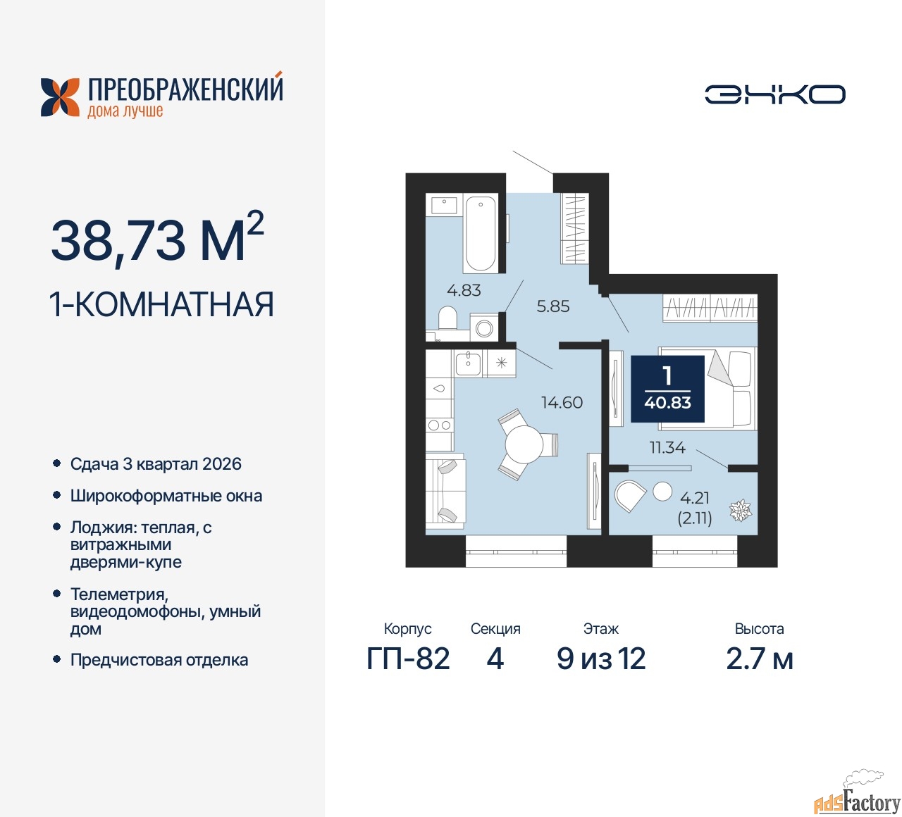 Дом монолитный, многоподъездный, переменной этажности, от 8 до 12 этажей. Квартира находится в 4-й секции высотой 12 этажей в корпусе ГП-82. На этаже 6 квартир. В подъезде 1 пассажирский и 1 грузовой лифт. Окончание строительства - 3 квартал 2026 года. Оформление сделки по договору долевого участия.