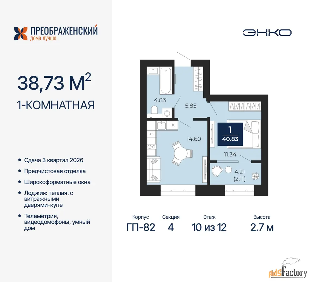| Высота потолков (м.) | 2.7 |