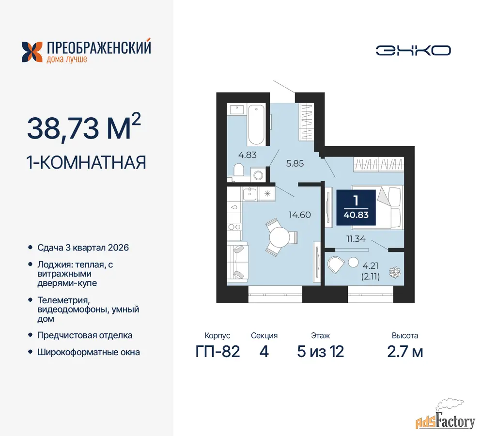 Дом монолитный, многоподъездный, переменной этажности, от 8 до 12 этажей. Квартира находится в 4-й секции высотой 12 этажей в корпусе ГП-82. На этаже 6 квартир. В подъезде 1 пассажирский и 1 грузовой лифт. Окончание строительства - 3 квартал 2026 года. Оформление сделки по договору долевого участия.