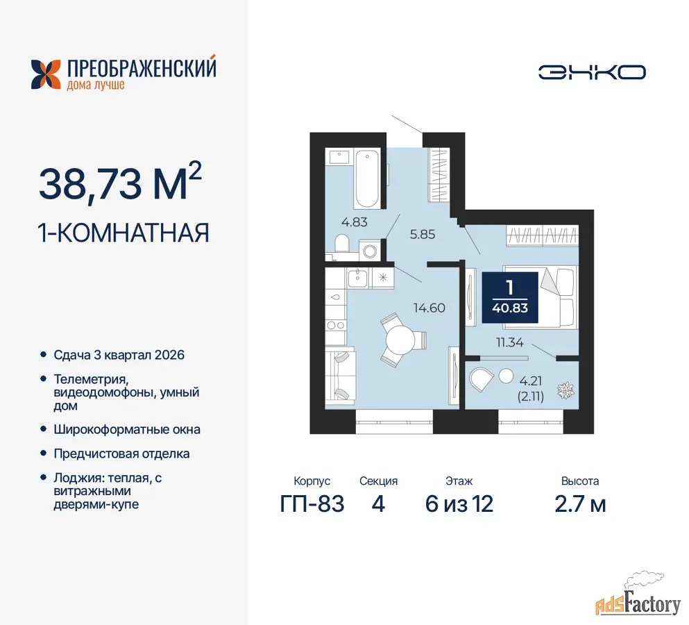 Дом монолитный, многоподъездный, переменной этажности, от 8 до 12 этажей. Квартира находится в 4-й секции высотой 12 этажей в корпусе ГП-83. На этаже 6 квартир. В подъезде 1 пассажирский и 1 грузовой лифт. Начало строительства - 4 квартал 2023 года. Окончание строительства - 3 квартал 2026 года. Оформление сделки по договору долевого участия.