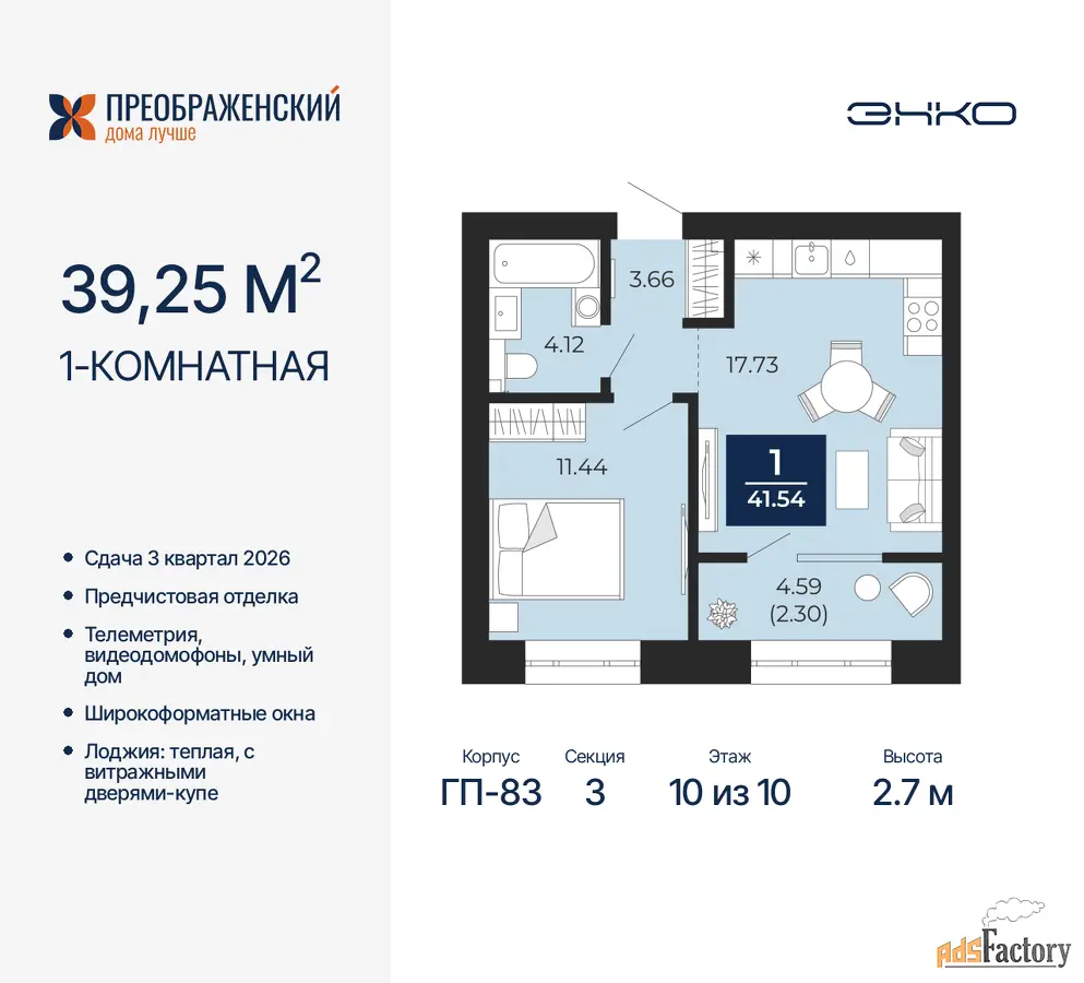 Дом монолитный, многоподъездный, переменной этажности, от 8 до 12 этажей. Квартира находится в 3-й секции высотой 10 этажей в корпусе ГП-83. На этаже 4 квартиры. В подъезде 1 пассажирский и 1 грузовой лифт. Начало строительства - 4 квартал 2023 года. Окончание строительства - 3 квартал 2026 года. Оформление сделки по договору долевого участия.