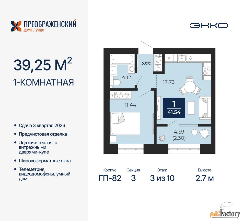 Дом монолитный, многоподъездный, переменной этажности, от 8 до 12 этажей. Квартира находится в 3-й секции высотой 10 этажей в корпусе ГП-82. На этаже 4 квартиры. В подъезде 1 пассажирский и 1 грузовой лифт. Окончание строительства - 3 квартал 2026 года. Оформление сделки по договору долевого участия.