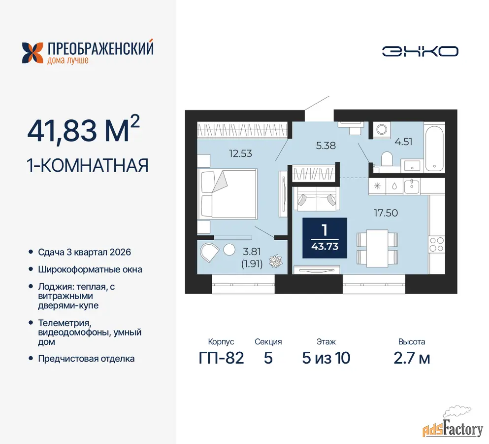 Дом монолитный, многоподъездный, переменной этажности, от 8 до 12 этажей. Квартира находится в 5-й секции высотой 10 этажей в корпусе ГП-82. На этаже 7 квартир. В подъезде 1 пассажирский и 1 грузовой лифт. Окончание строительства - 3 квартал 2026 года. Оформление сделки по договору долевого участия.