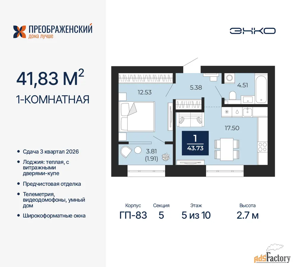 Дом монолитный, многоподъездный, переменной этажности, от 8 до 12 этажей. Квартира находится в 5-й секции высотой 10 этажей в корпусе ГП-83. На этаже 7 квартир. В подъезде 1 пассажирский и 1 грузовой лифт. Начало строительства - 4 квартал 2023 года. Окончание строительства - 3 квартал 2026 года. Оформление сделки по договору долевого участия.