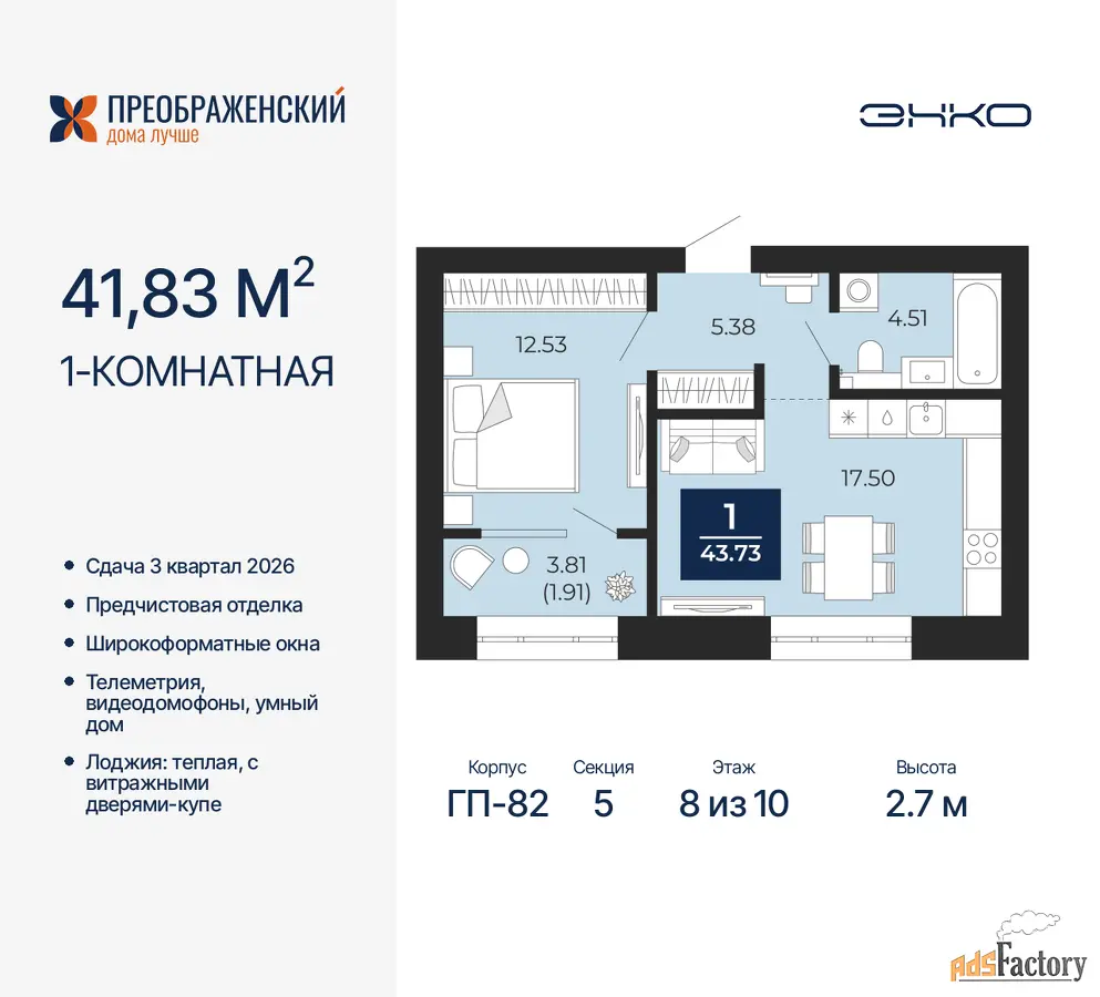 Дом монолитный, многоподъездный, переменной этажности, от 8 до 12 этажей. Квартира находится в 5-й секции высотой 10 этажей в корпусе ГП-82. На этаже 7 квартир. В подъезде 1 пассажирский и 1 грузовой лифт. Окончание строительства - 3 квартал 2026 года. Оформление сделки по договору долевого участия.