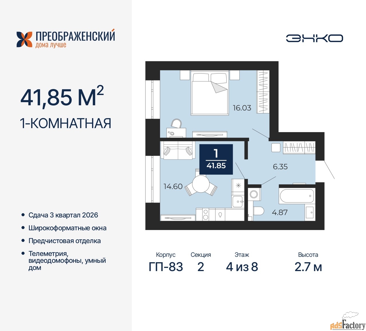 Дом монолитный, многоподъездный, переменной этажности, от 8 до 12 этажей. Квартира находится во 2-й секции высотой 8 этажей в корпусе ГП-83. На этаже 6 квартир. В подъезде 1 грузовой лифт. Начало строительства - 4 квартал 2023 года. Окончание строительства - 3 квартал 2026 года. Оформление сделки по договору долевого участия.