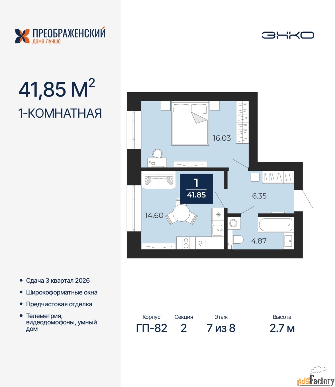 Дом монолитный, многоподъездный, переменной этажности, от 8 до 12 этажей. Квартира находится во 2-й секции высотой 8 этажей в корпусе ГП-82. На этаже 6 квартир. В подъезде 1 пассажирский и 1 грузовой лифт. Окончание строительства - 3 квартал 2026 года. Оформление сделки по договору долевого участия.