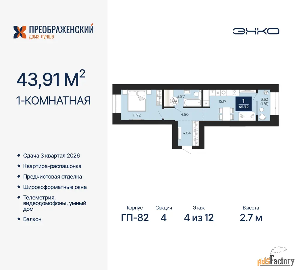 | Высота потолков (м.) | 2.7 |