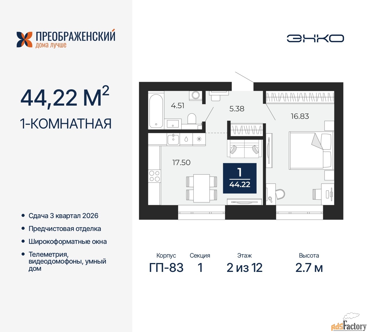 | Высота потолков (м.) | 2.7 |