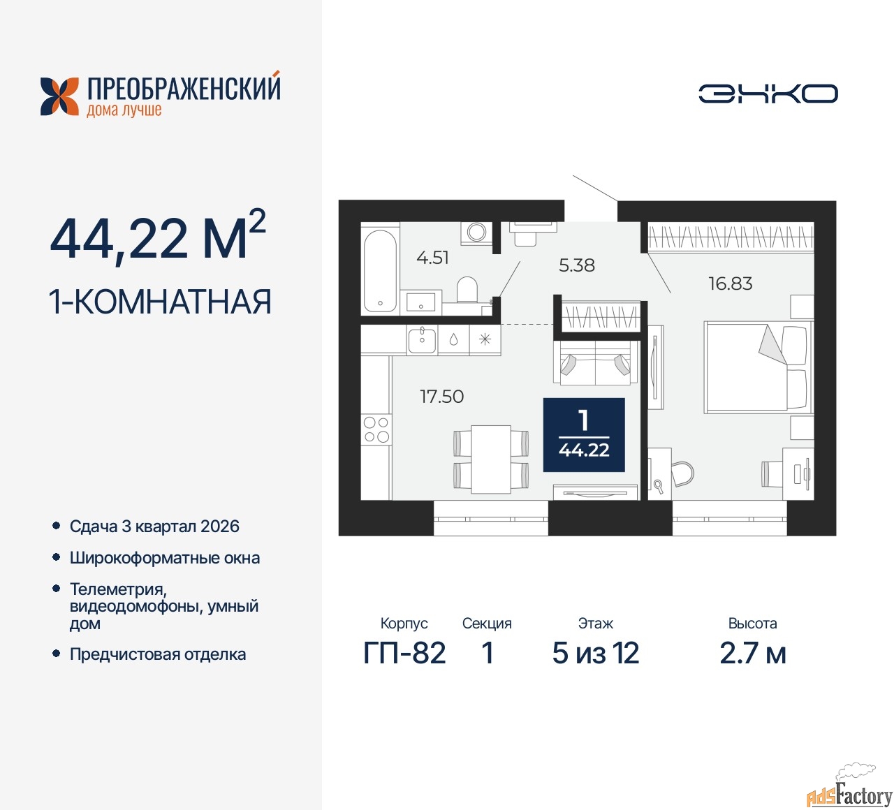 Дом монолитный, многоподъездный, переменной этажности, от 8 до 12 этажей. Квартира находится в 1-й секции высотой 12 этажей в корпусе ГП-82. На этаже 7 квартир. В подъезде 1 пассажирский и 1 грузовой лифт. Окончание строительства - 3 квартал 2026 года. Оформление сделки по договору долевого участия.