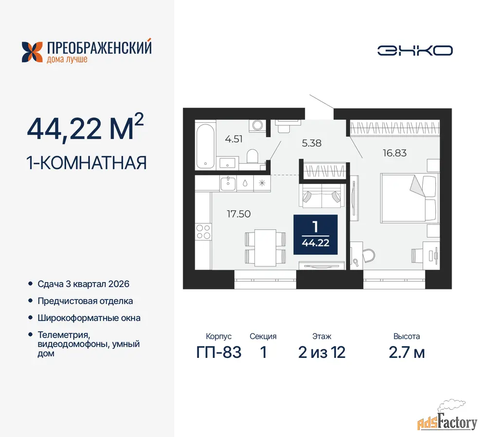 Дом монолитный, многоподъездный, переменной этажности, от 8 до 12 этажей. Квартира находится в 1-й секции высотой 12 этажей в корпусе ГП-83. На этаже 7 квартир. В подъезде 1 грузовой лифт. Начало строительства - 4 квартал 2023 года. Окончание строительства - 3 квартал 2026 года. Оформление сделки по договору долевого участия.