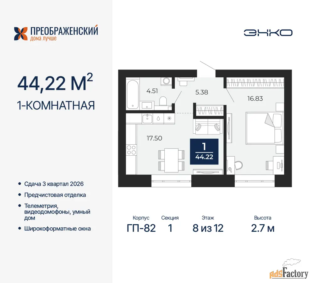 Дом монолитный, многоподъездный, переменной этажности, от 8 до 12 этажей. Квартира находится в 1-й секции высотой 12 этажей в корпусе ГП-82. На этаже 7 квартир. В подъезде 1 пассажирский и 1 грузовой лифт. Окончание строительства - 3 квартал 2026 года. Оформление сделки по договору долевого участия.