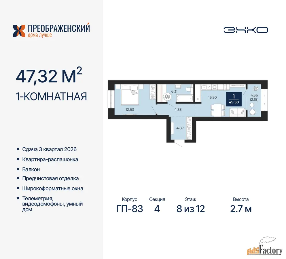 Дом монолитный, многоподъездный, переменной этажности, от 8 до 12 этажей. Квартира находится в 4-й секции высотой 12 этажей в корпусе ГП-83. На этаже 6 квартир. В подъезде 1 пассажирский и 1 грузовой лифт. Начало строительства - 4 квартал 2023 года. Окончание строительства - 3 квартал 2026 года. Оформление сделки по договору долевого участия.