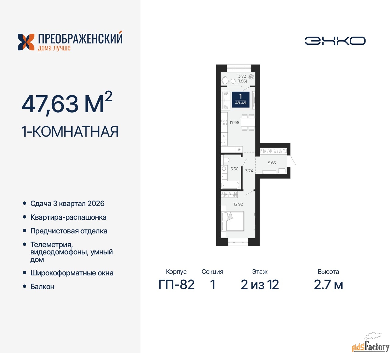 | Высота потолков (м.) | 2.7 |