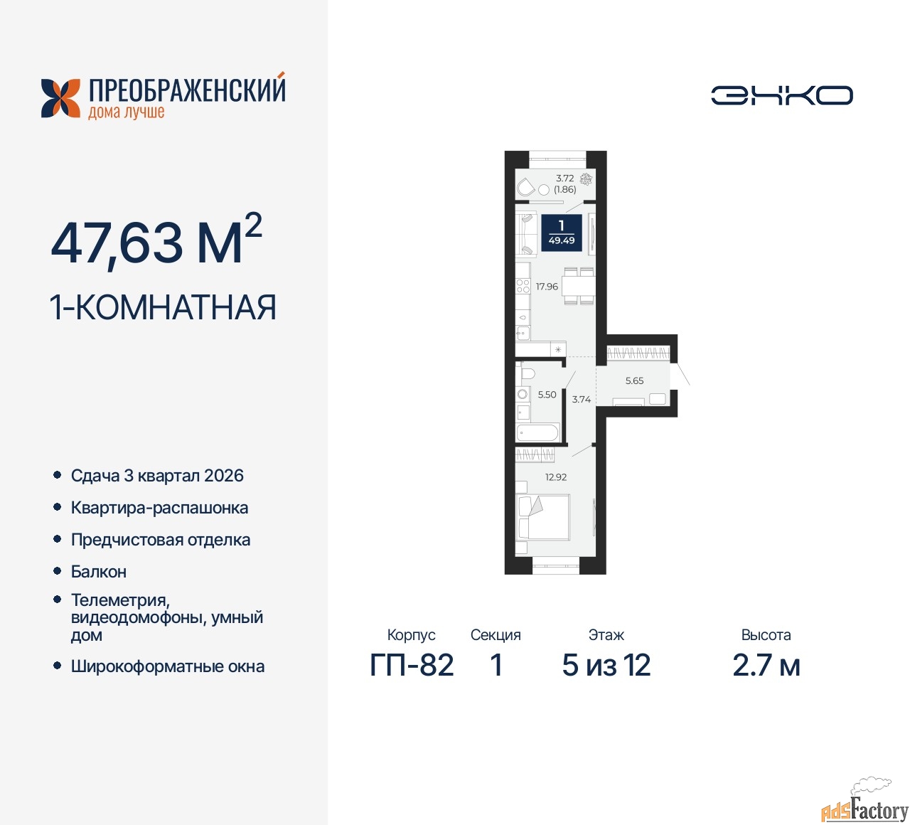 Дом монолитный, многоподъездный, переменной этажности, от 8 до 12 этажей. Квартира находится в 1-й секции высотой 12 этажей в корпусе ГП-82. На этаже 7 квартир. В подъезде 1 пассажирский и 1 грузовой лифт. Окончание строительства - 3 квартал 2026 года. Оформление сделки по договору долевого участия.
