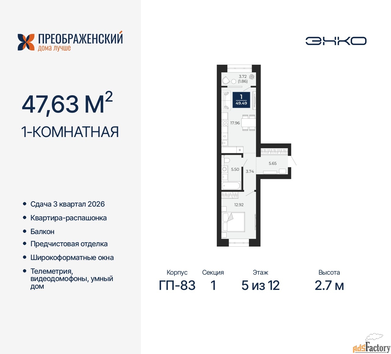Дом монолитный, многоподъездный, переменной этажности, от 8 до 12 этажей. Квартира находится в 1-й секции высотой 12 этажей в корпусе ГП-83. На этаже 7 квартир. В подъезде 1 грузовой лифт. Начало строительства - 4 квартал 2023 года. Окончание строительства - 3 квартал 2026 года. Оформление сделки по договору долевого участия.