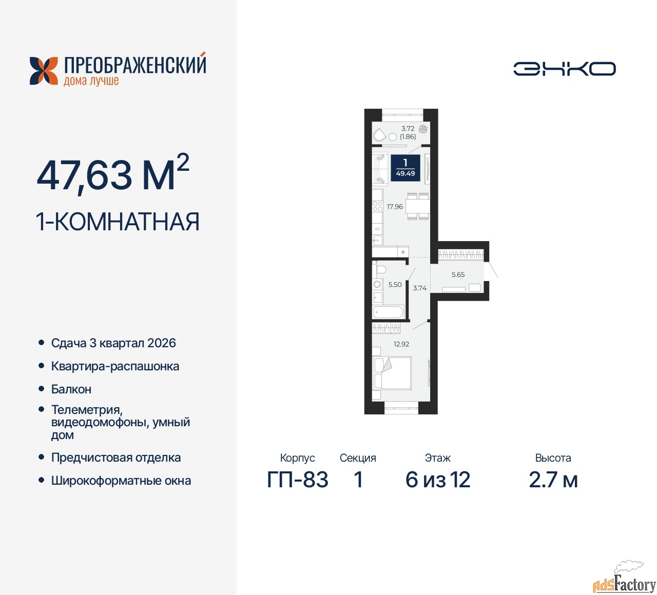 Дом монолитный, многоподъездный, переменной этажности, от 8 до 12 этажей. Квартира находится в 1-й секции высотой 12 этажей в корпусе ГП-83. На этаже 7 квартир. В подъезде 1 грузовой лифт. Начало строительства - 4 квартал 2023 года. Окончание строительства - 3 квартал 2026 года. Оформление сделки по договору долевого участия.