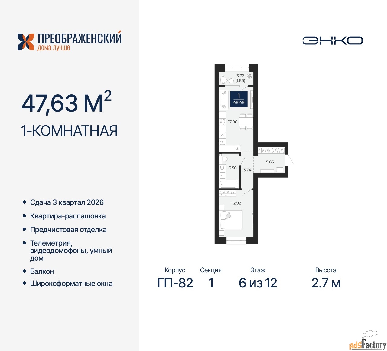 | Высота потолков (м.) | 2.7 |