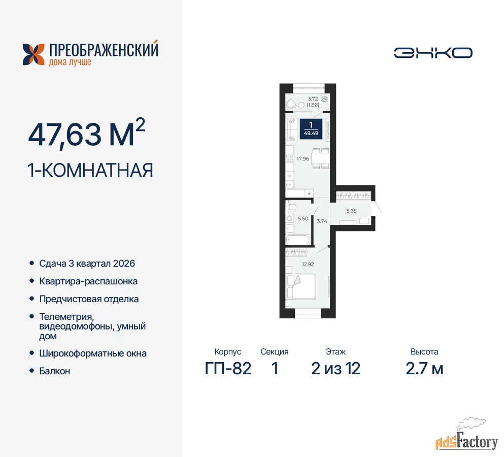 Дом монолитный, многоподъездный, переменной этажности, от 8 до 12 этажей. Квартира находится в 1-й секции высотой 12 этажей в корпусе ГП-82. На этаже 7 квартир. В подъезде 1 пассажирский и 1 грузовой лифт. Окончание строительства - 3 квартал 2026 года. Оформление сделки по договору долевого участия.