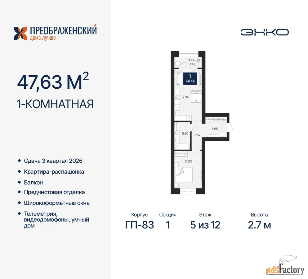 Дом монолитный, многоподъездный, переменной этажности, от 8 до 12 этажей. Квартира находится в 1-й секции высотой 12 этажей в корпусе ГП-83. На этаже 7 квартир. В подъезде 1 грузовой лифт. Начало строительства - 4 квартал 2023 года. Окончание строительства - 3 квартал 2026 года. Оформление сделки по договору долевого участия.