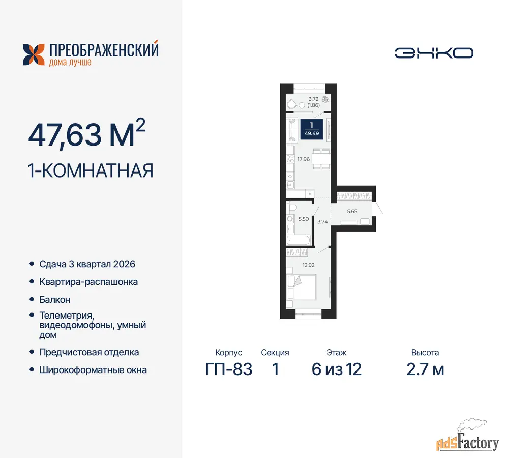 Дом монолитный, многоподъездный, переменной этажности, от 8 до 12 этажей. Квартира находится в 1-й секции высотой 12 этажей в корпусе ГП-83. На этаже 7 квартир. В подъезде 1 грузовой лифт. Начало строительства - 4 квартал 2023 года. Окончание строительства - 3 квартал 2026 года. Оформление сделки по договору долевого участия.