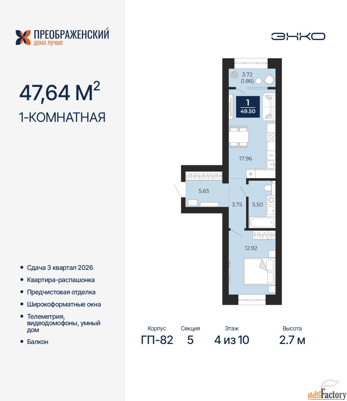 Дом монолитный, многоподъездный, переменной этажности, от 8 до 12 этажей. Квартира находится в 5-й секции высотой 10 этажей в корпусе ГП-82. На этаже 7 квартир. В подъезде 1 пассажирский и 1 грузовой лифт. Окончание строительства - 3 квартал 2026 года. Оформление сделки по договору долевого участия.