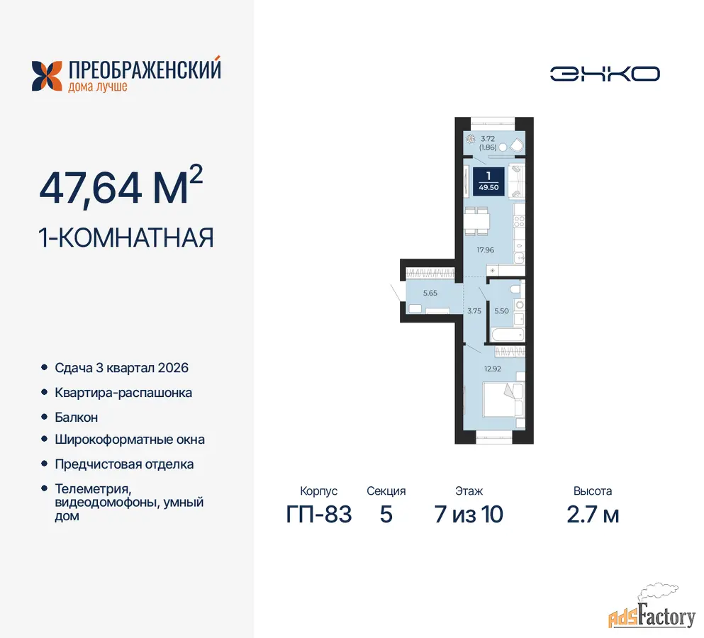 | Высота потолков (м.) | 2.7 |