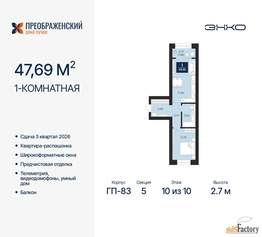 Дом монолитный, многоподъездный, переменной этажности, от 8 до 12 этажей. Квартира находится в 5-й секции высотой 10 этажей в корпусе ГП-83. На этаже 7 квартир. В подъезде 1 пассажирский и 1 грузовой лифт. Начало строительства - 4 квартал 2023 года. Окончание строительства - 3 квартал 2026 года. Оформление сделки по договору долевого участия.