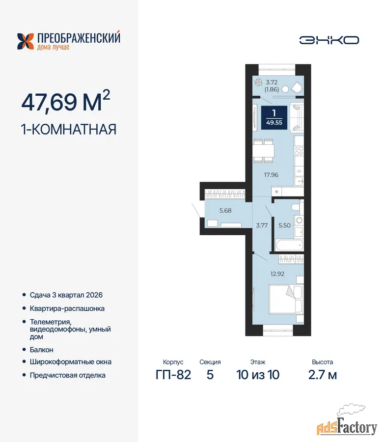 Дом монолитный, многоподъездный, переменной этажности, от 8 до 12 этажей. Квартира находится в 5-й секции высотой 10 этажей в корпусе ГП-82. На этаже 7 квартир. В подъезде 1 пассажирский и 1 грузовой лифт. Окончание строительства - 3 квартал 2026 года. Оформление сделки по договору долевого участия.