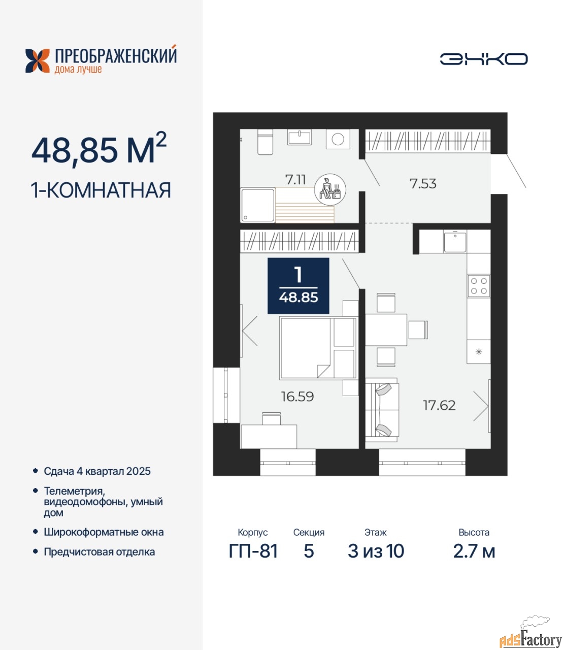 Дом кирпичный, многоподъездный, переменной этажности, от 8 до 12 этажей. Квартира находится в 5-й секции высотой 10 этажей в корпусе ГП-81. На этаже 8 квартир. В подъезде 1 пассажирский и 1 грузовой лифт. Начало строительства - 1 квартал 2023 года. Окончание строительства - 4 квартал 2025 года. Оформление сделки по договору долевого участия.