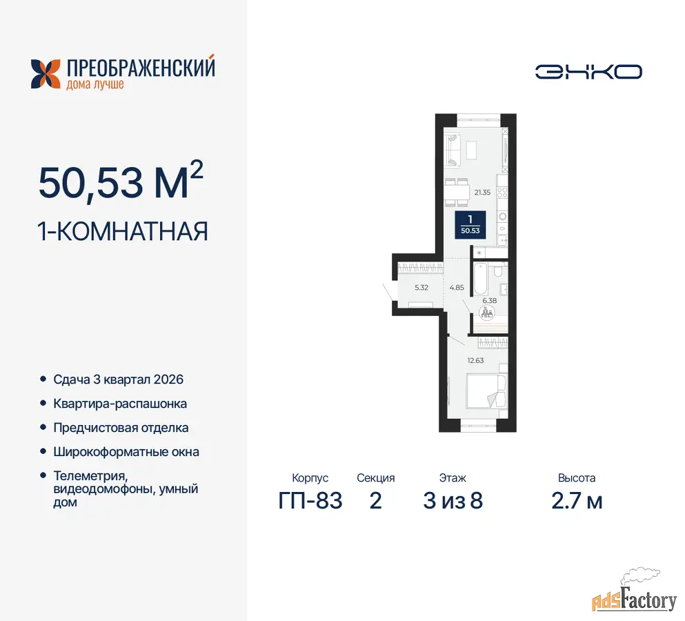 | Высота потолков (м.) | 2.7 |