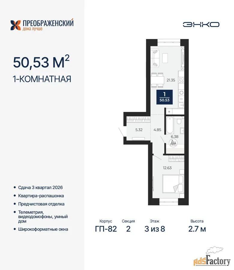 Дом монолитный, многоподъездный, переменной этажности, от 8 до 12 этажей. Квартира находится во 2-й секции высотой 8 этажей в корпусе ГП-82. На этаже 6 квартир. В подъезде 1 пассажирский и 1 грузовой лифт. Окончание строительства - 3 квартал 2026 года. Оформление сделки по договору долевого участия.