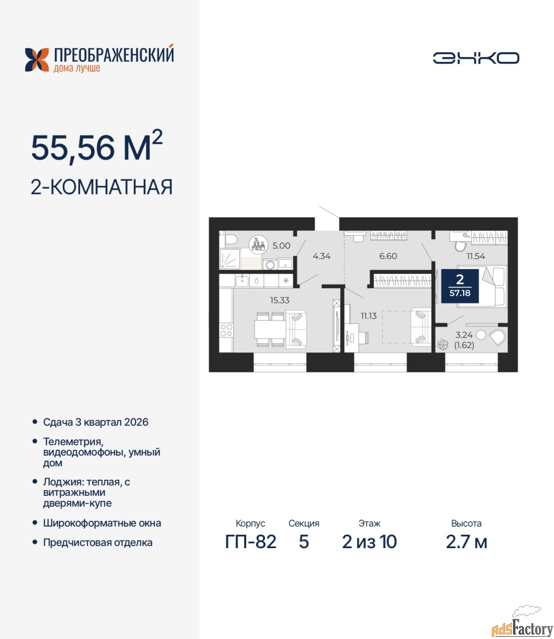 | Общая площадь (кв.м) | 55.56 |