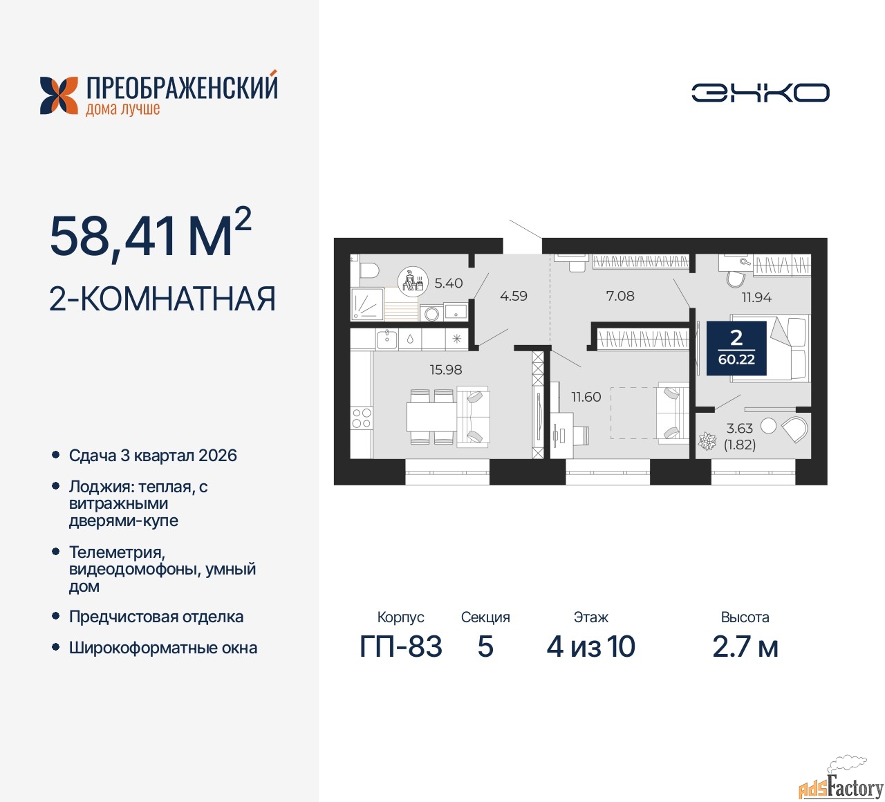 Дом монолитный, многоподъездный, переменной этажности, от 8 до 12 этажей. Квартира находится в 5-й секции высотой 10 этажей в корпусе ГП-83. На этаже 7 квартир. В подъезде 1 пассажирский и 1 грузовой лифт. Начало строительства - 4 квартал 2023 года. Окончание строительства - 3 квартал 2026 года. Оформление сделки по договору долевого участия.