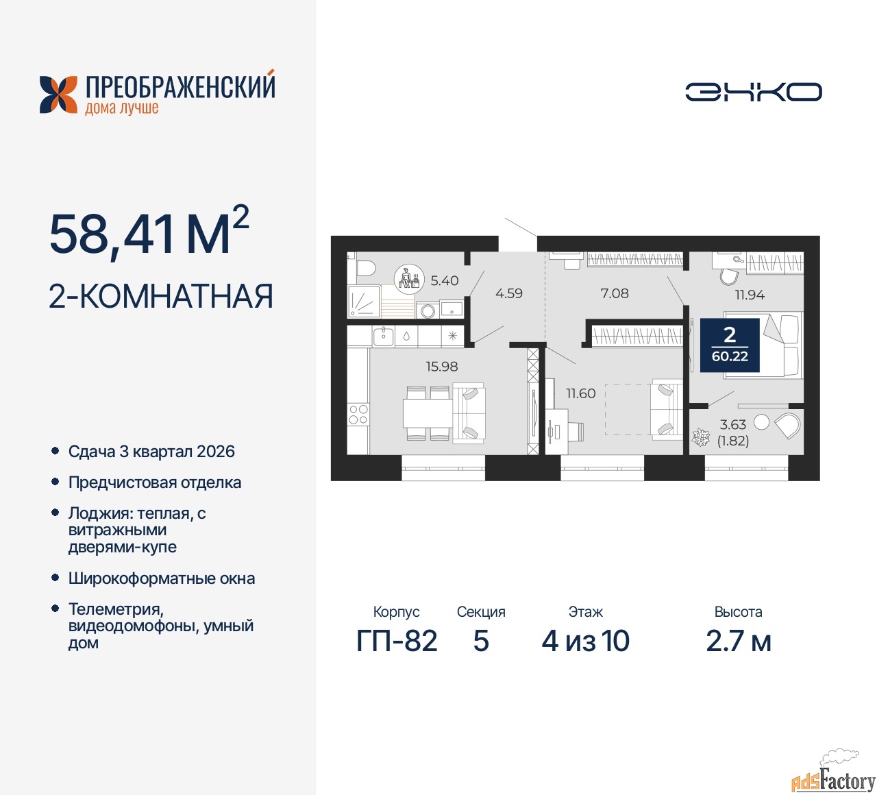 Дом монолитный, многоподъездный, переменной этажности, от 8 до 12 этажей. Квартира находится в 5-й секции высотой 10 этажей в корпусе ГП-82. На этаже 7 квартир. В подъезде 1 пассажирский и 1 грузовой лифт. Окончание строительства - 3 квартал 2026 года. Оформление сделки по договору долевого участия.