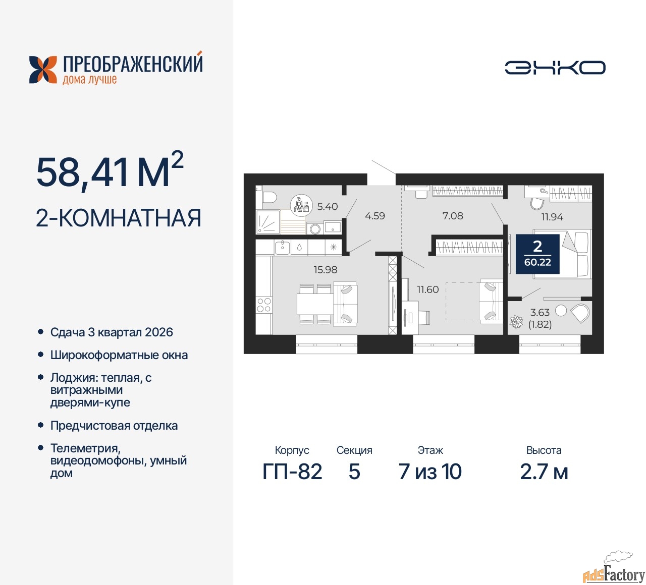 Дом монолитный, многоподъездный, переменной этажности, от 8 до 12 этажей. Квартира находится в 5-й секции высотой 10 этажей в корпусе ГП-82. На этаже 7 квартир. В подъезде 1 пассажирский и 1 грузовой лифт. Окончание строительства - 3 квартал 2026 года. Оформление сделки по договору долевого участия.