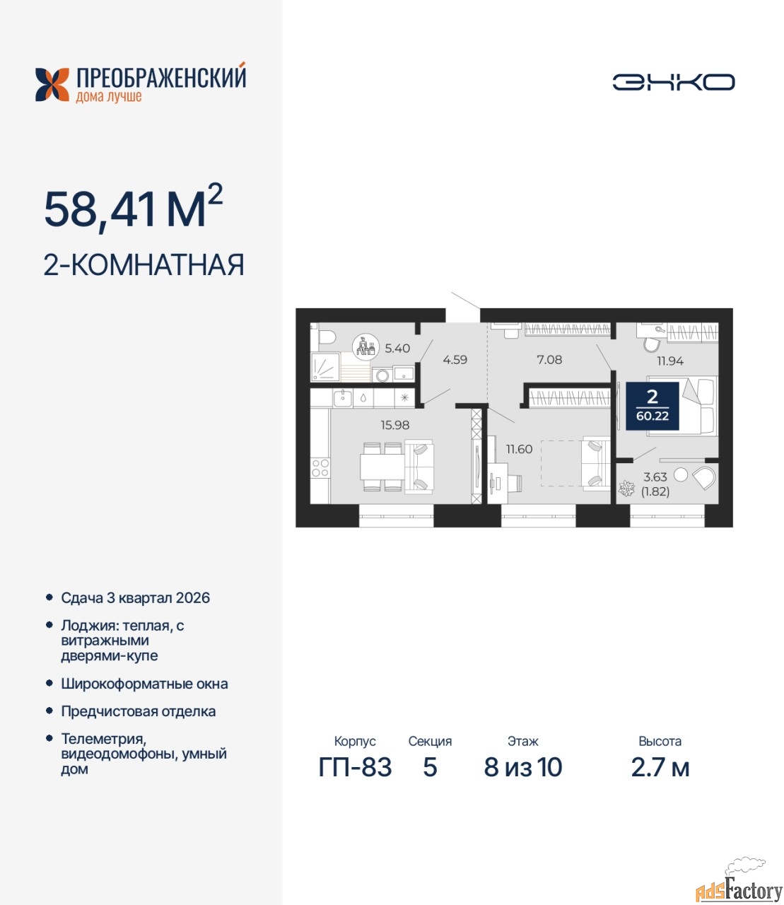 Дом монолитный, многоподъездный, переменной этажности, от 8 до 12 этажей. Квартира находится в 5-й секции высотой 10 этажей в корпусе ГП-83. На этаже 7 квартир. В подъезде 1 пассажирский и 1 грузовой лифт. Начало строительства - 4 квартал 2023 года. Окончание строительства - 3 квартал 2026 года. Оформление сделки по договору долевого участия.