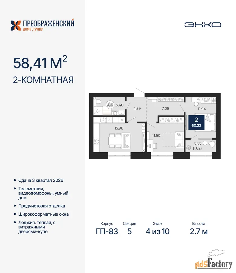 | Общая площадь (кв.м) | 58.41 |