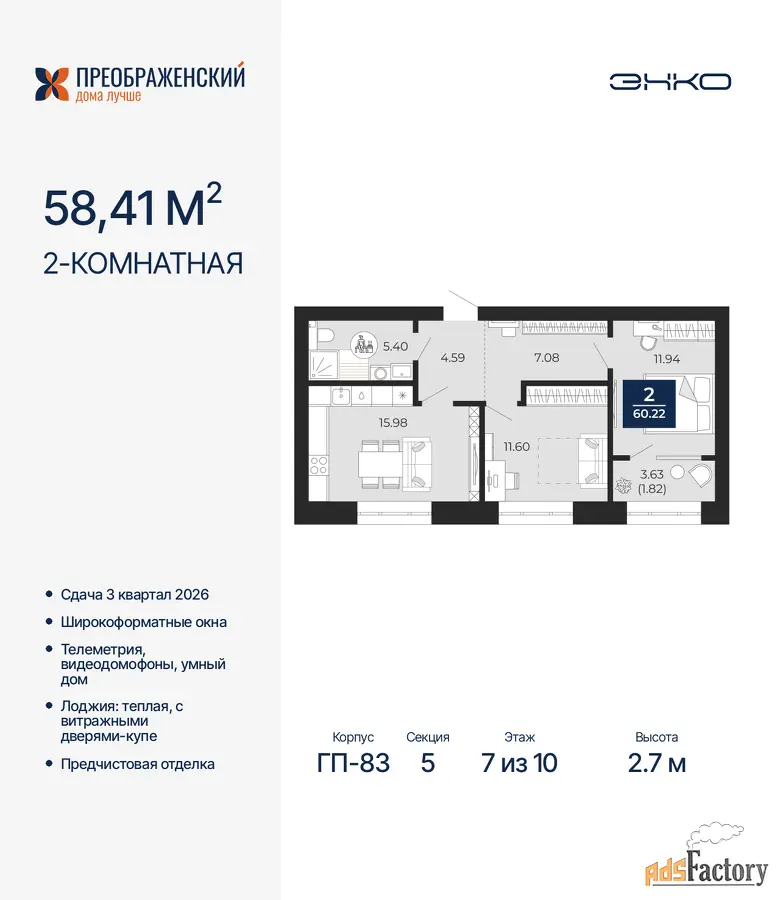 | Общая площадь (кв.м) | 58.41 |