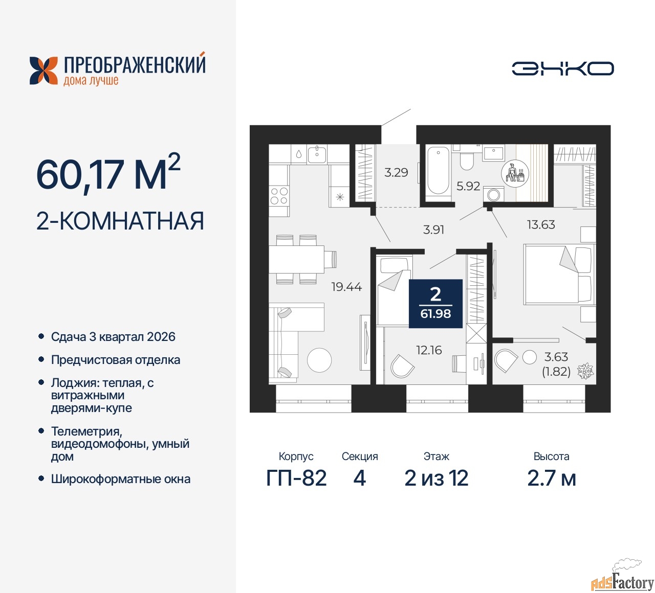 Дом монолитный, многоподъездный, переменной этажности, от 8 до 12 этажей. Квартира находится в 4-й секции высотой 12 этажей в корпусе ГП-82. На этаже 6 квартир. В подъезде 1 пассажирский и 1 грузовой лифт. Окончание строительства - 3 квартал 2026 года. Оформление сделки по договору долевого участия.