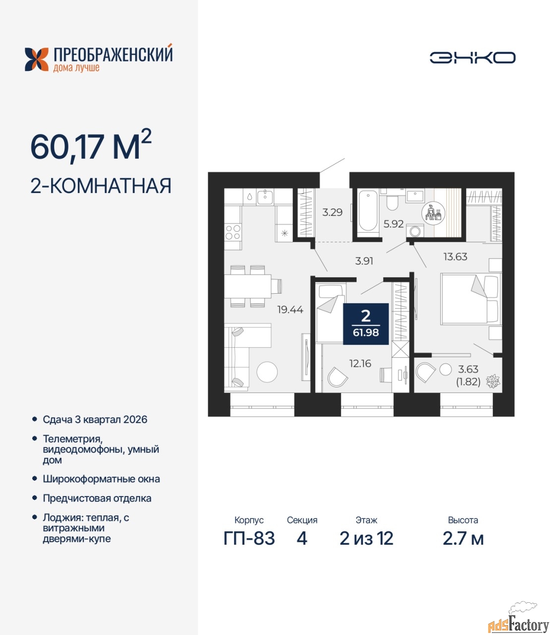 Дом монолитный, многоподъездный, переменной этажности, от 8 до 12 этажей. Квартира находится в 4-й секции высотой 12 этажей в корпусе ГП-83. На этаже 6 квартир. В подъезде 1 пассажирский и 1 грузовой лифт. Начало строительства - 4 квартал 2023 года. Окончание строительства - 3 квартал 2026 года. Оформление сделки по договору долевого участия.